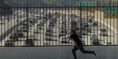 You can even see police lights from his security vehicle flashing.